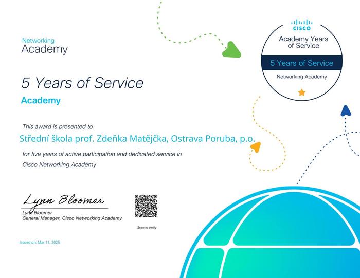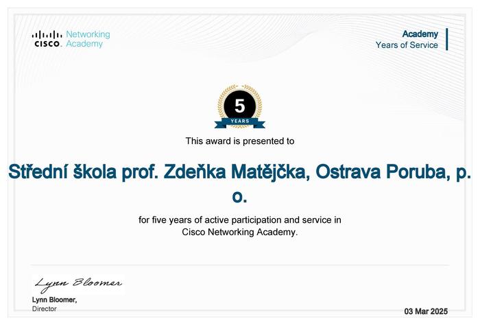 CISCO akademie, mezinárodně uznávaná instituce v mnoha zemích světa, působí na naší škole již pátým rokem, v oblasti IT - informačních technologiích. Během této doby se její činnosti aktivně zúčastnilo 135 studentů, kteří díky své píli získali 76 certifikátů.