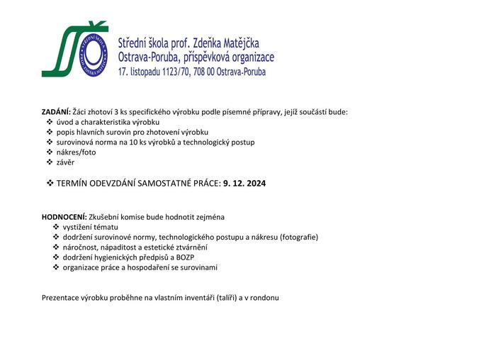ZADÁNÍ: Žáci zhotoví 3 ks specifického výrobku podle písemné přípravy, jejíž součástí bude: